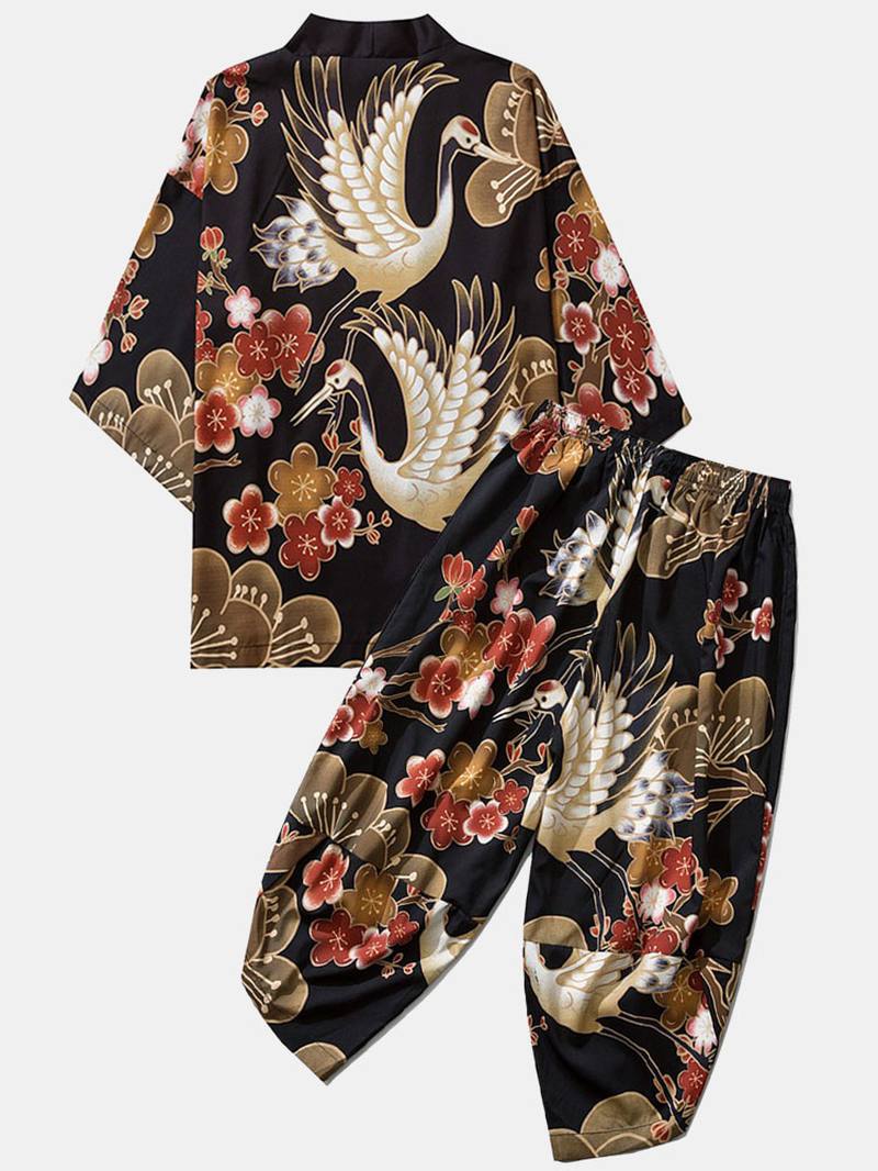 Miesten Japanilainen Kimono Crane Flower Painatus Open Front & Pants Co-ords