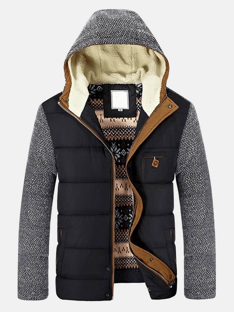 Miesten patchwork paksu vetoketjullinen pitkähihainen hupullinen takki taskulla