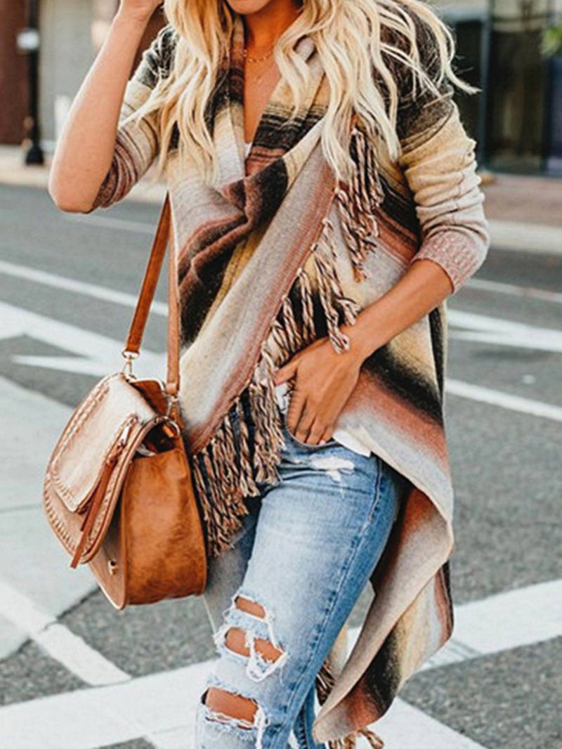 Naisten raidallinen tupsu, edessä avoin neule pitkähihainen epäsäännöllinen helma neuletakki