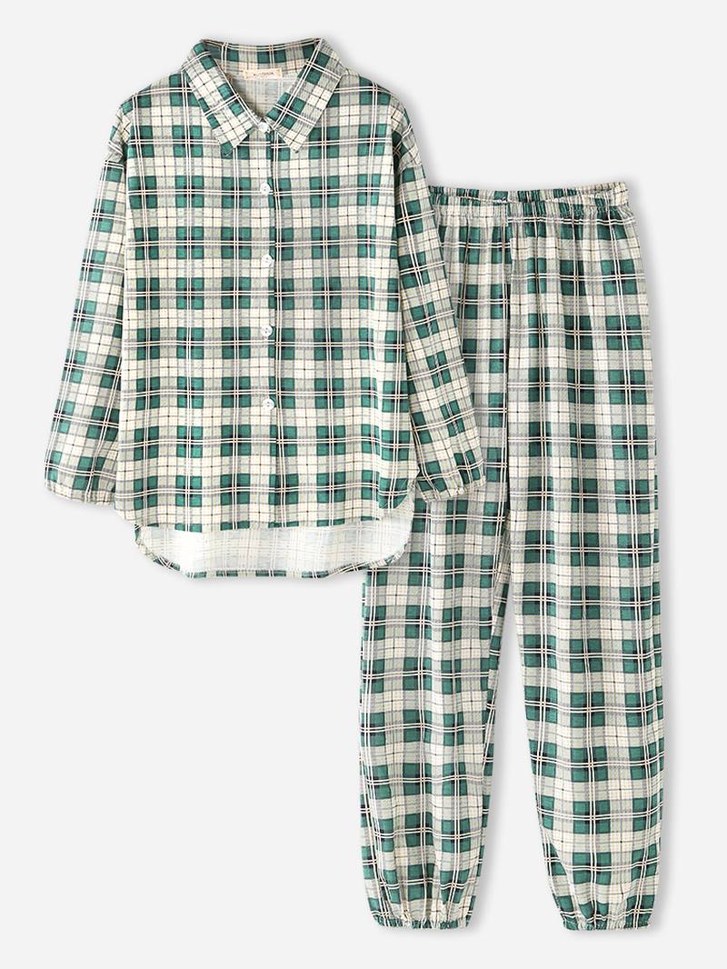 Naisten Ruudullinen Painatus Käänne Korkea-matala Helma Paita Jousto Vyötäröhousut Koti Pyjama Set
