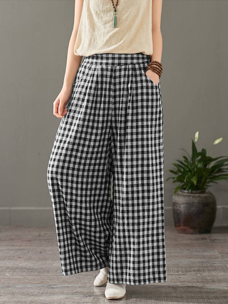 Naisten Ruudullinen Painatusti Joustava Vyötärö Vintage Rennot Löysät Leveät Housut Taskuilla