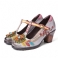 Retromaalattu kukkainen, nahkapäällysteinen kantapää, T-hihna, solki, paksut korkokengät