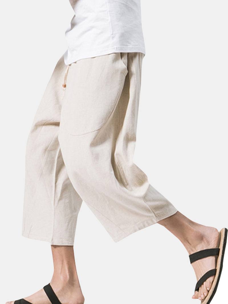 Tyylikkäät Miesten Puuvillaliinavaatteet Pussikkaat Löysät Pohkeen Pituiset Housut Antibakteeriset Vapaa-ajan Shortsit