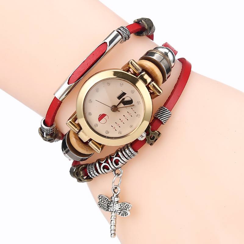 Vintage monikerroksinen naisten rannekoru Kello Diamond Dragonfly Riipus nahkaranneke Kvartsikello