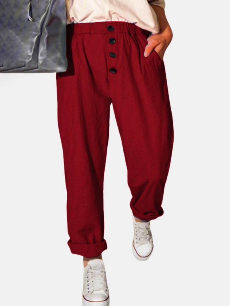 Yksiväriset Napit Taskut Löysät Vapaa-ajan Housut Naisille